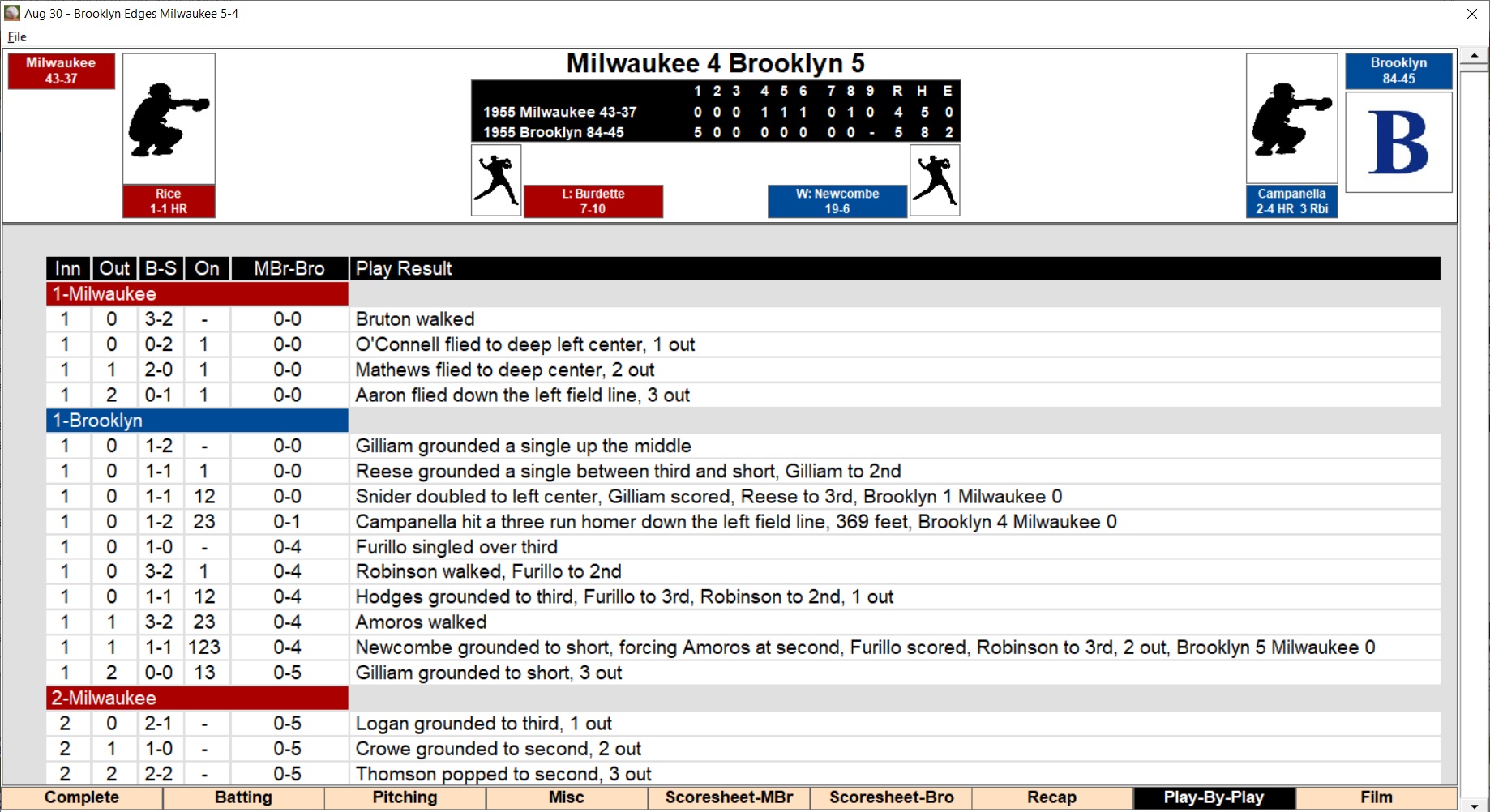 batter, pitcher and ball-strike count. Pitch-by-pitch mode can be utilized