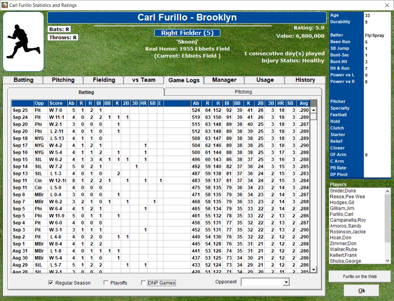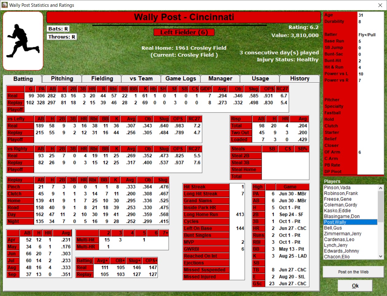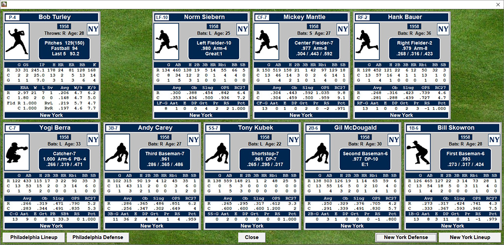 including player game and season stats to date, fielder range, throwing arm