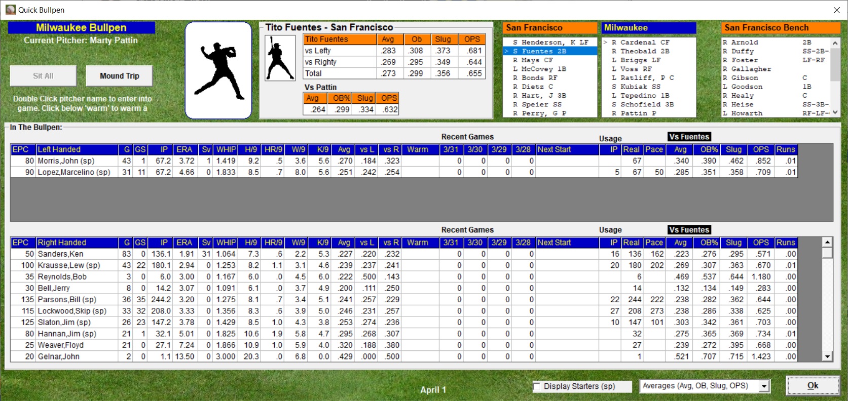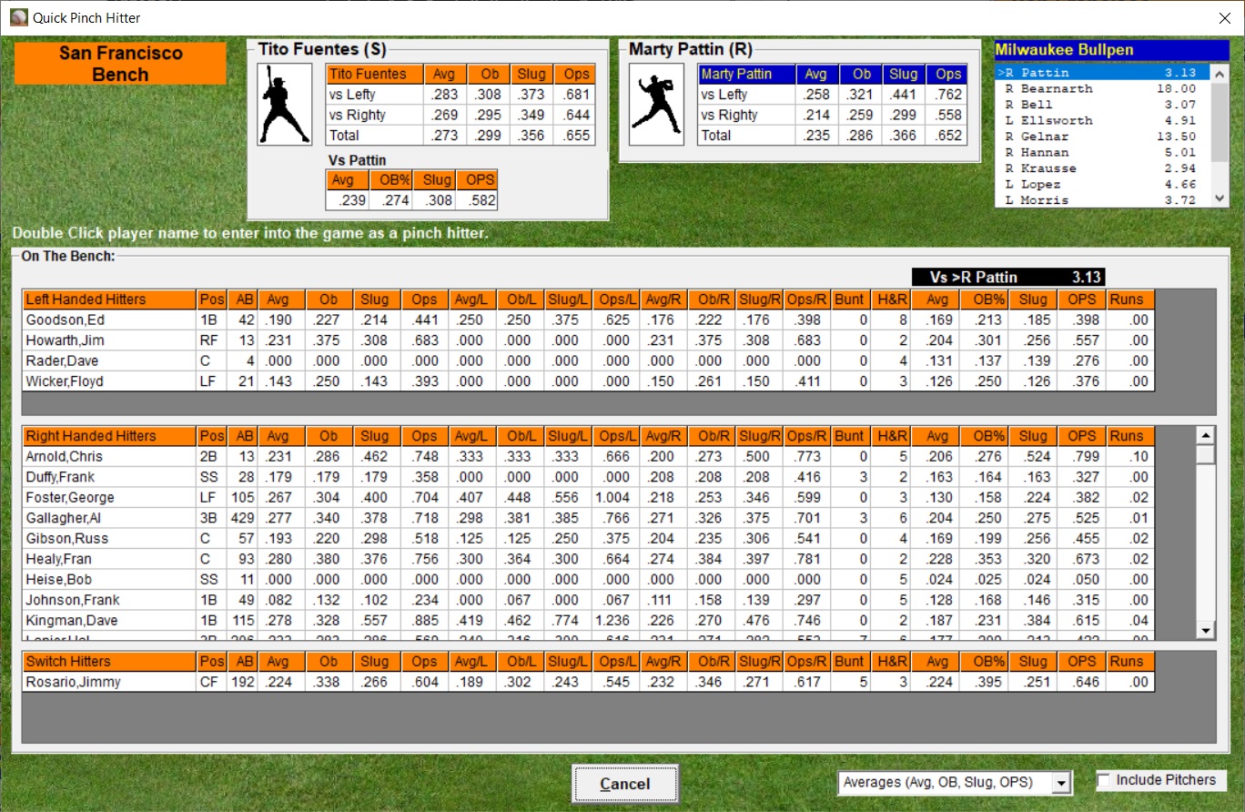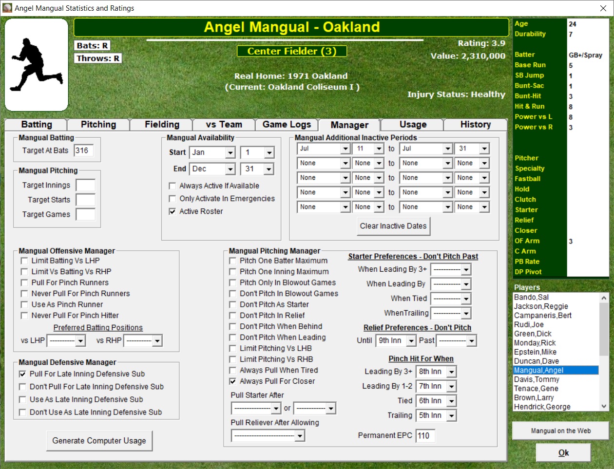 bullpens. Set individual player usage. Set special situations,